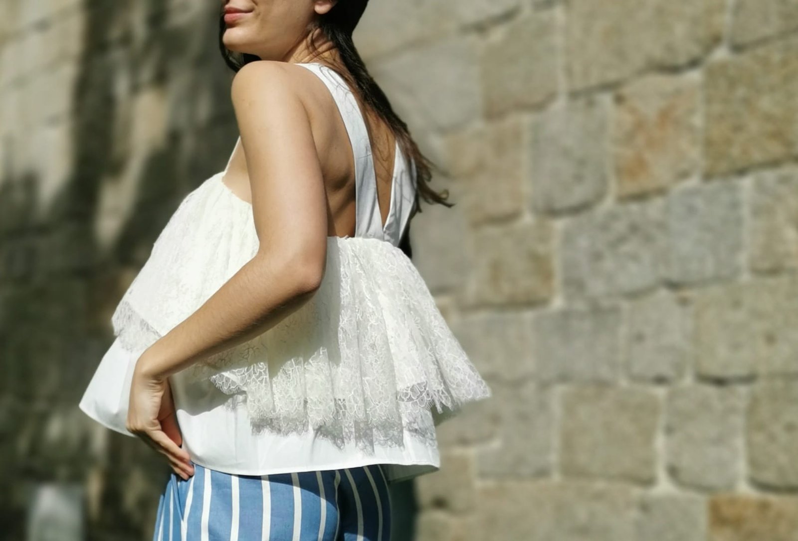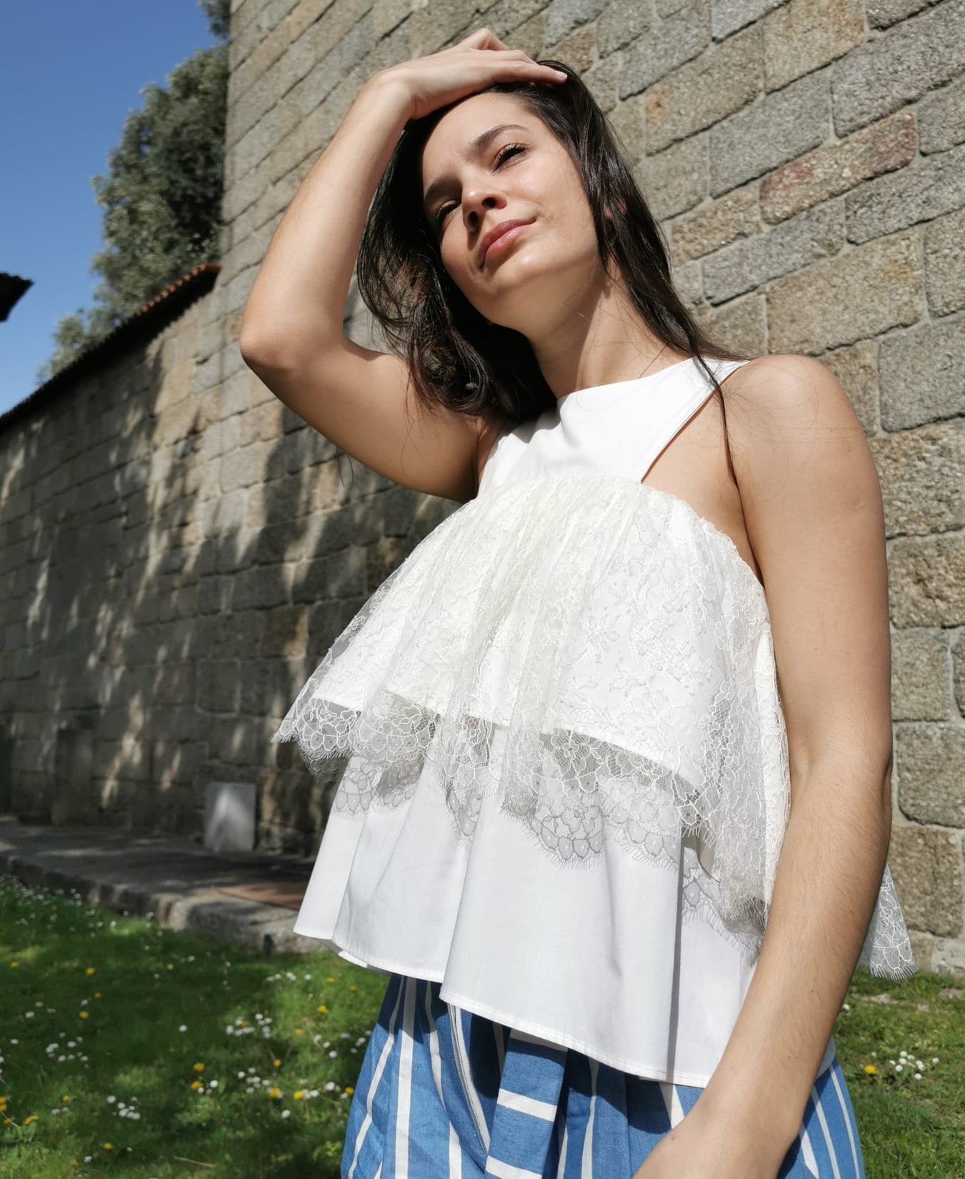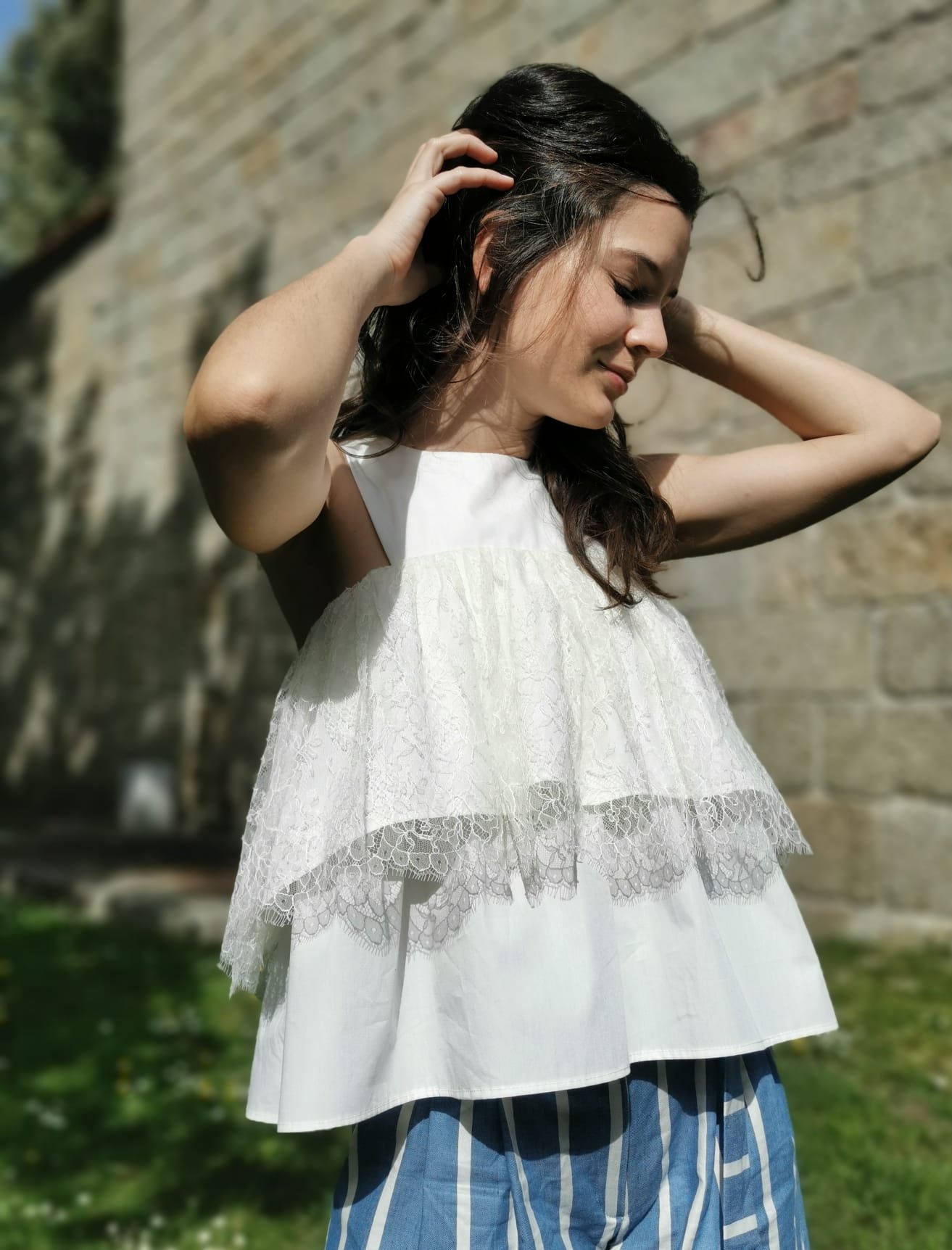 Blusa efeito balão, dois folhos mais folho renda chantili e decote com alsas