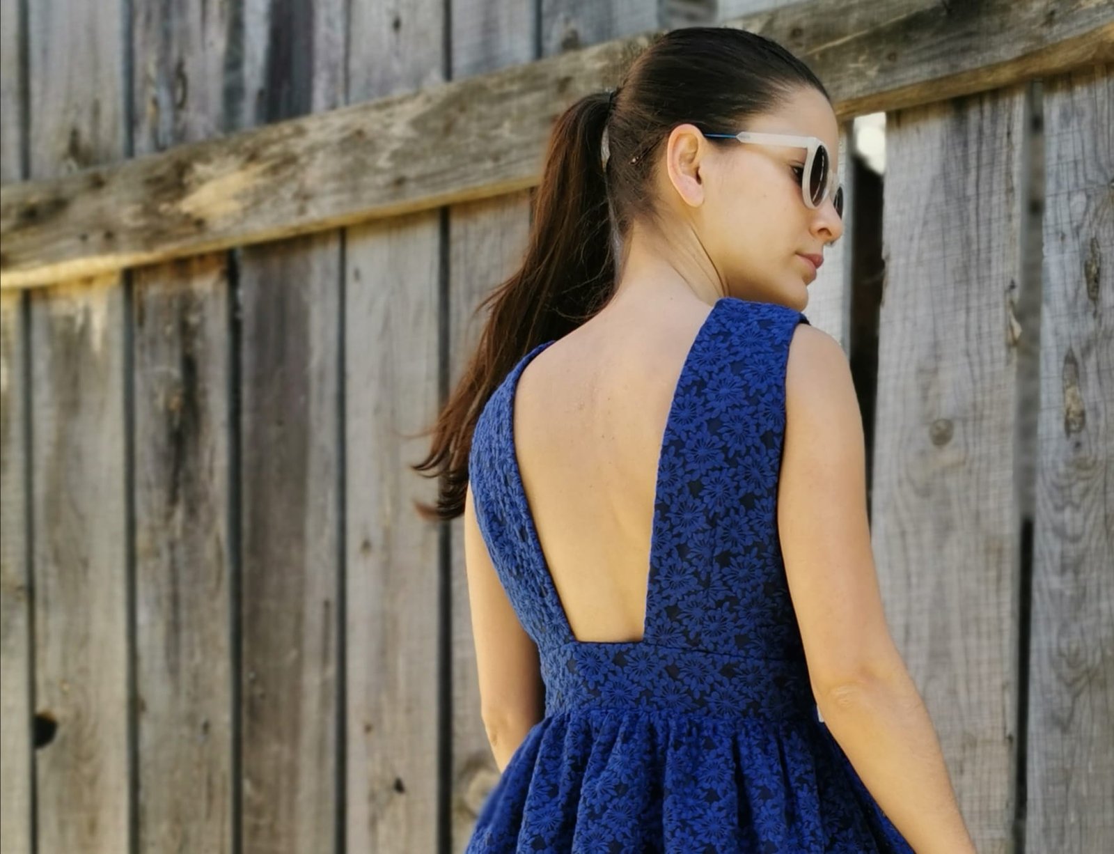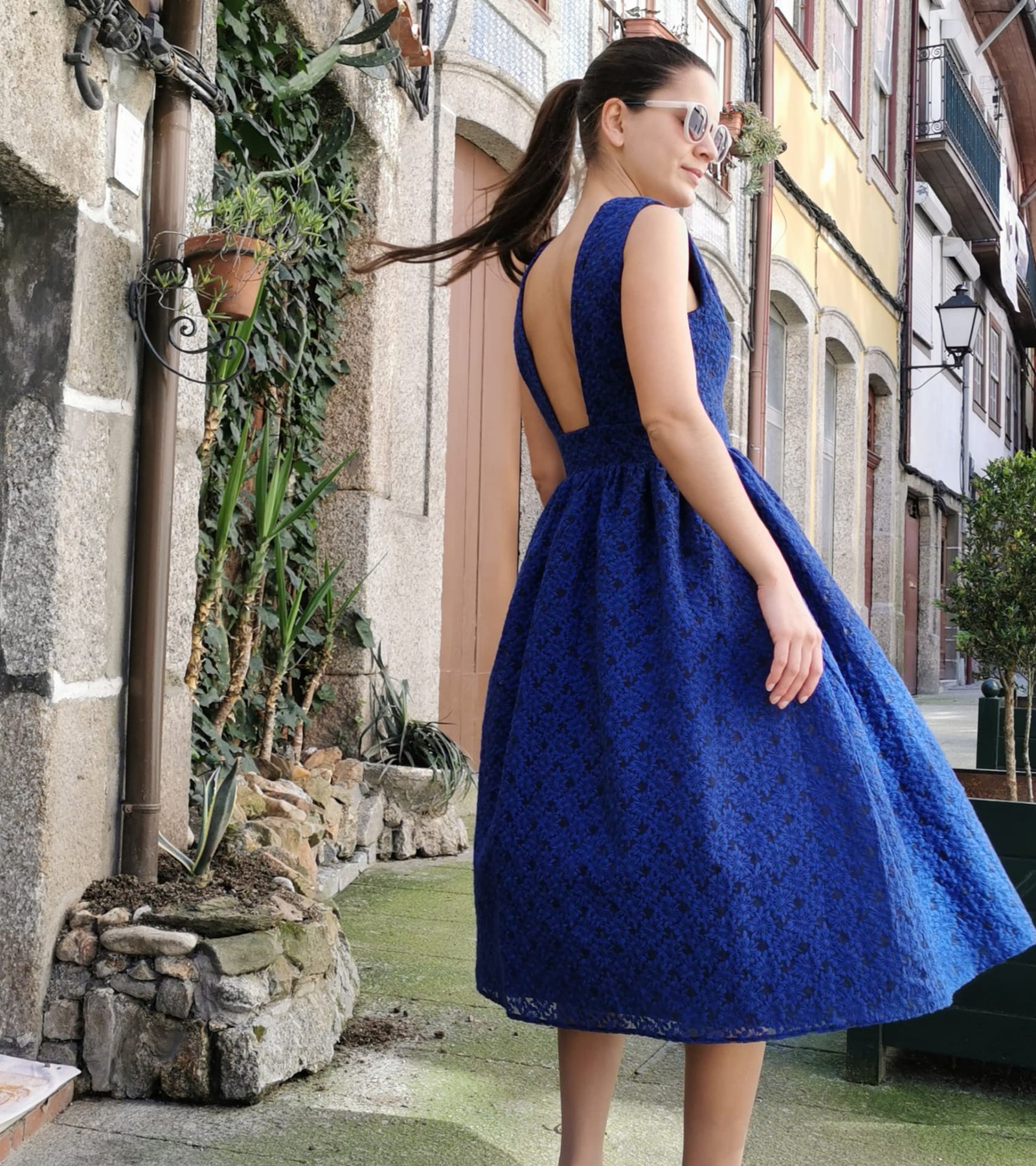 Vestido Azul rodado, cintura alta, decote em V pronunciada e costas abertas.