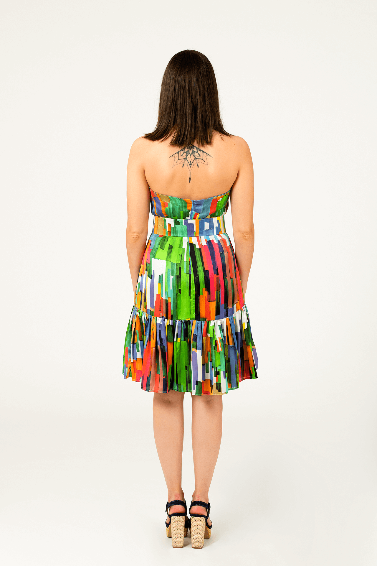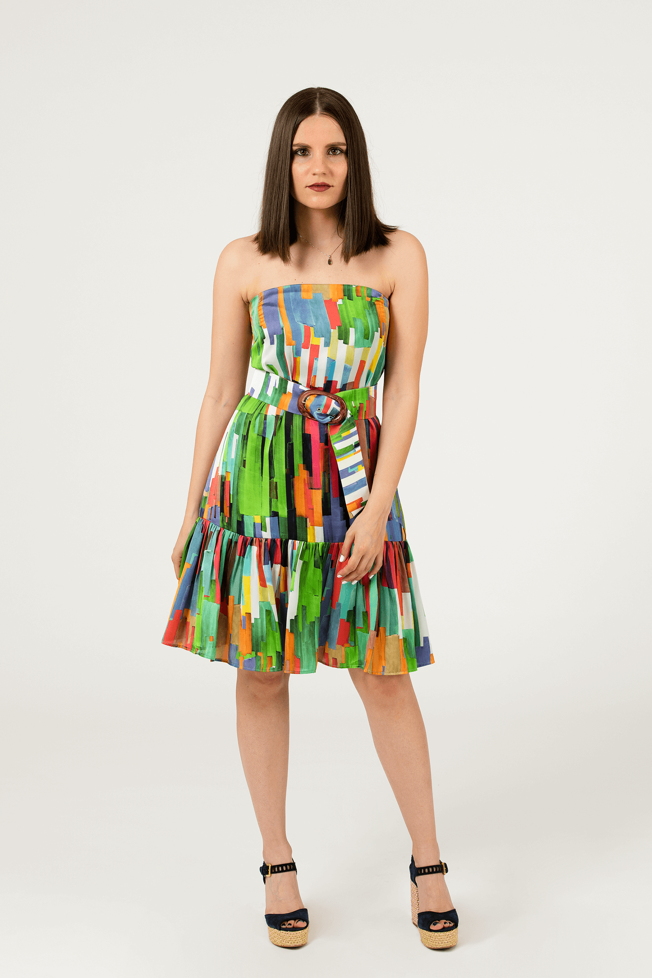 Vestido curto caicai com folho embaixo, cinto do mesmo tecido, aperta atrás com fecho invisível.