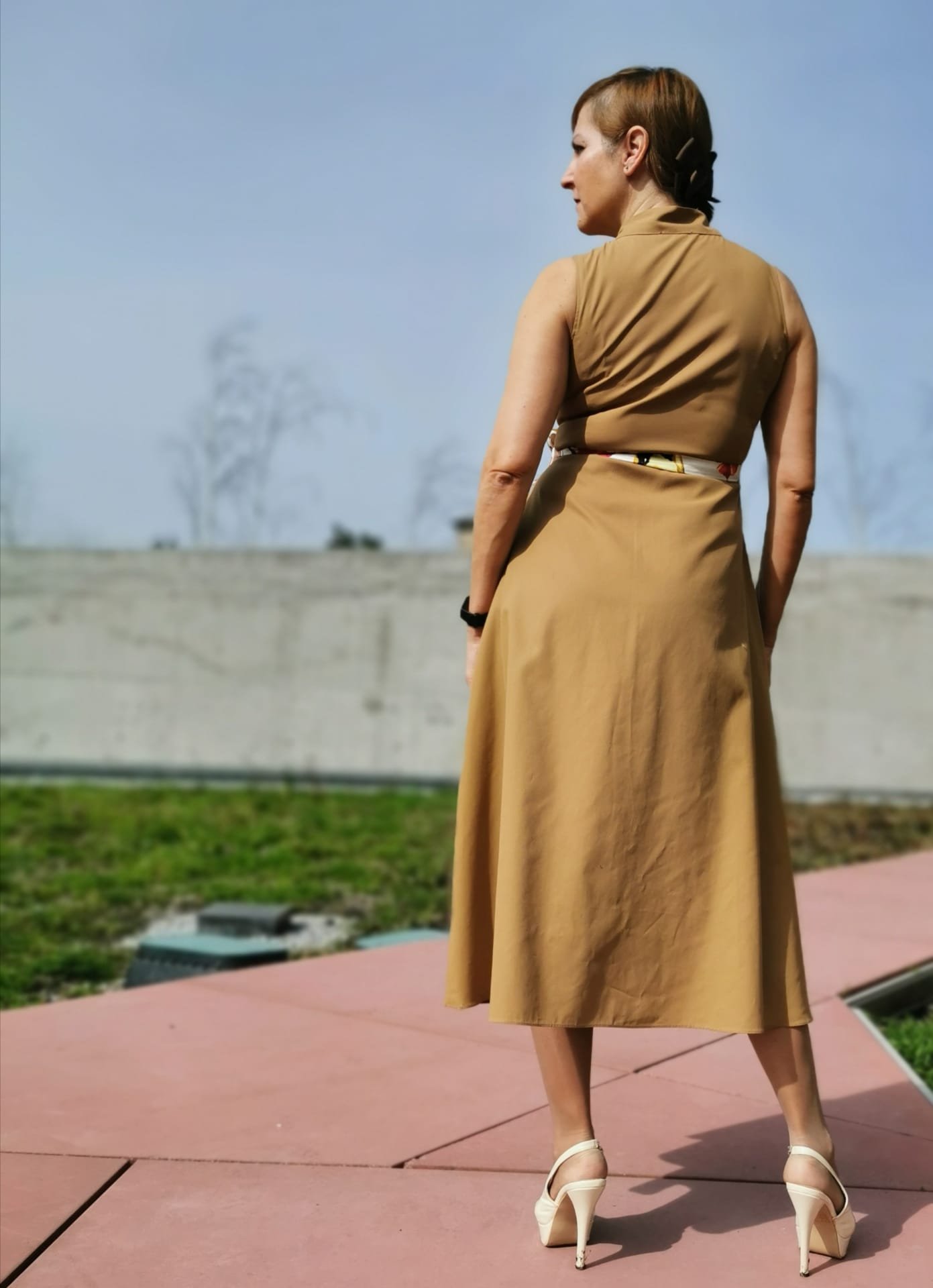 Vestido Camel aberto c/ aselhas, botões forrados, saia evasê