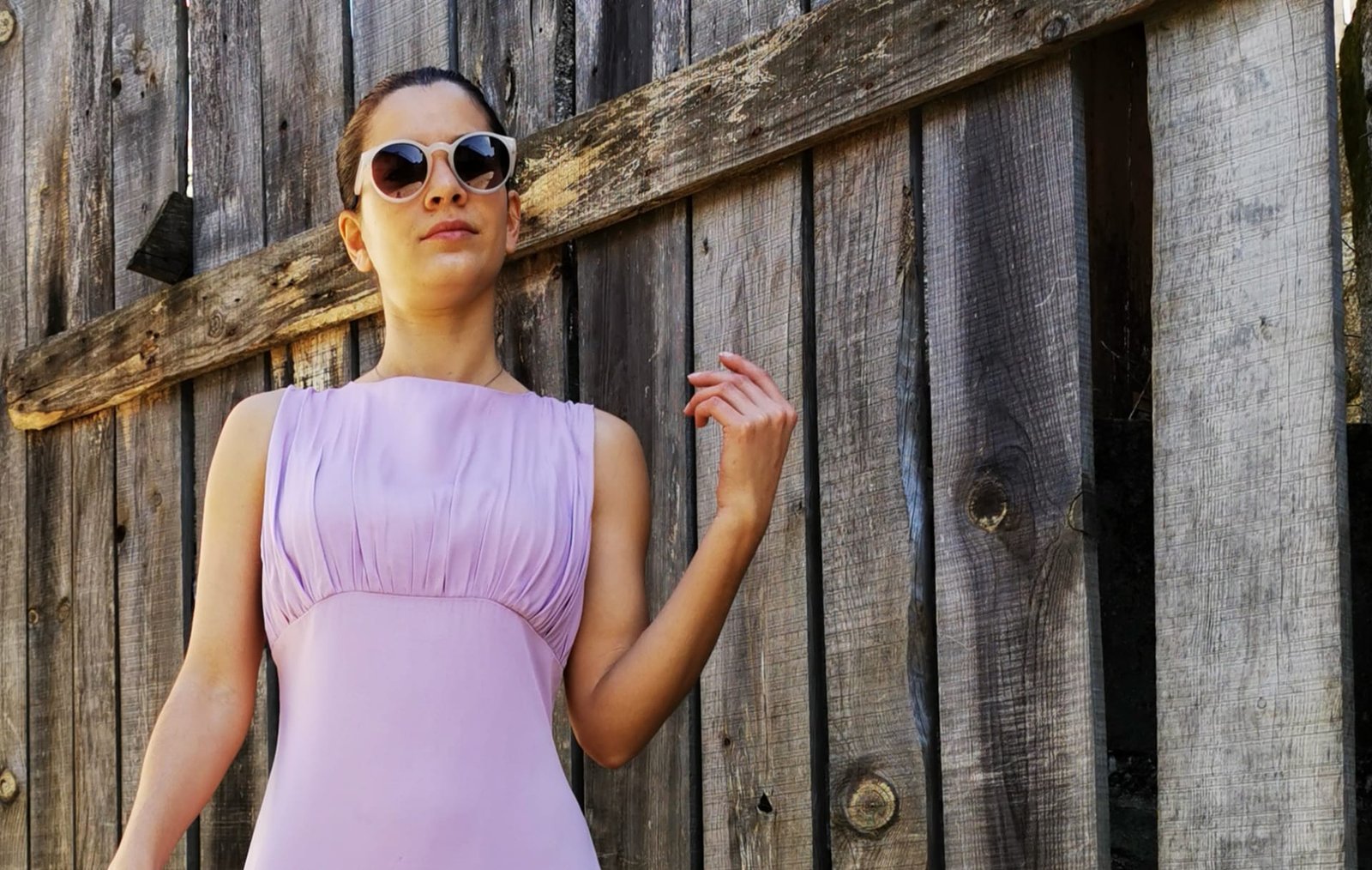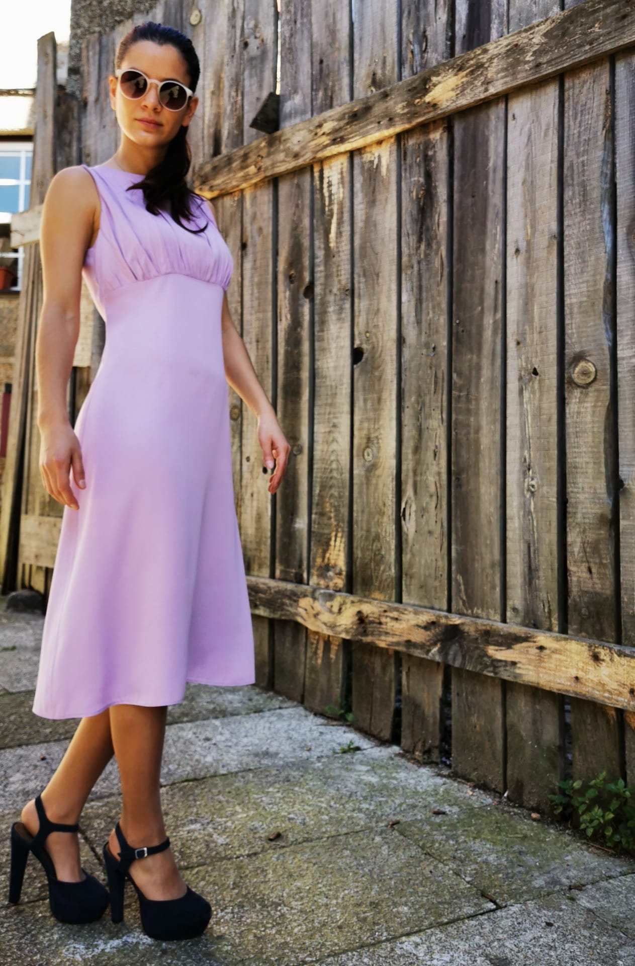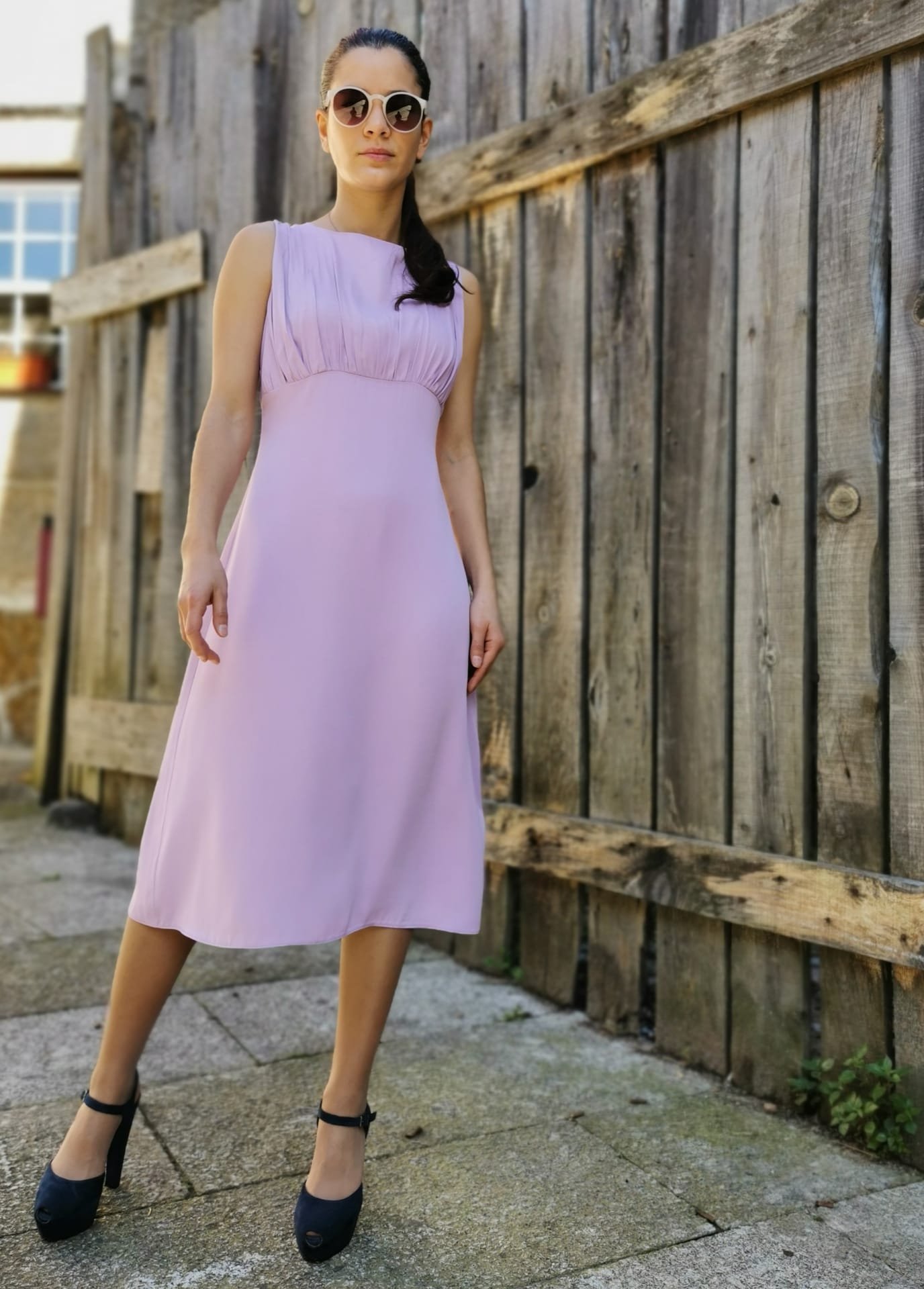 Vestido cintado com corte franzido abaixo do peito. Base ligeiro évasé. Aperta atrás com fecho invisível.