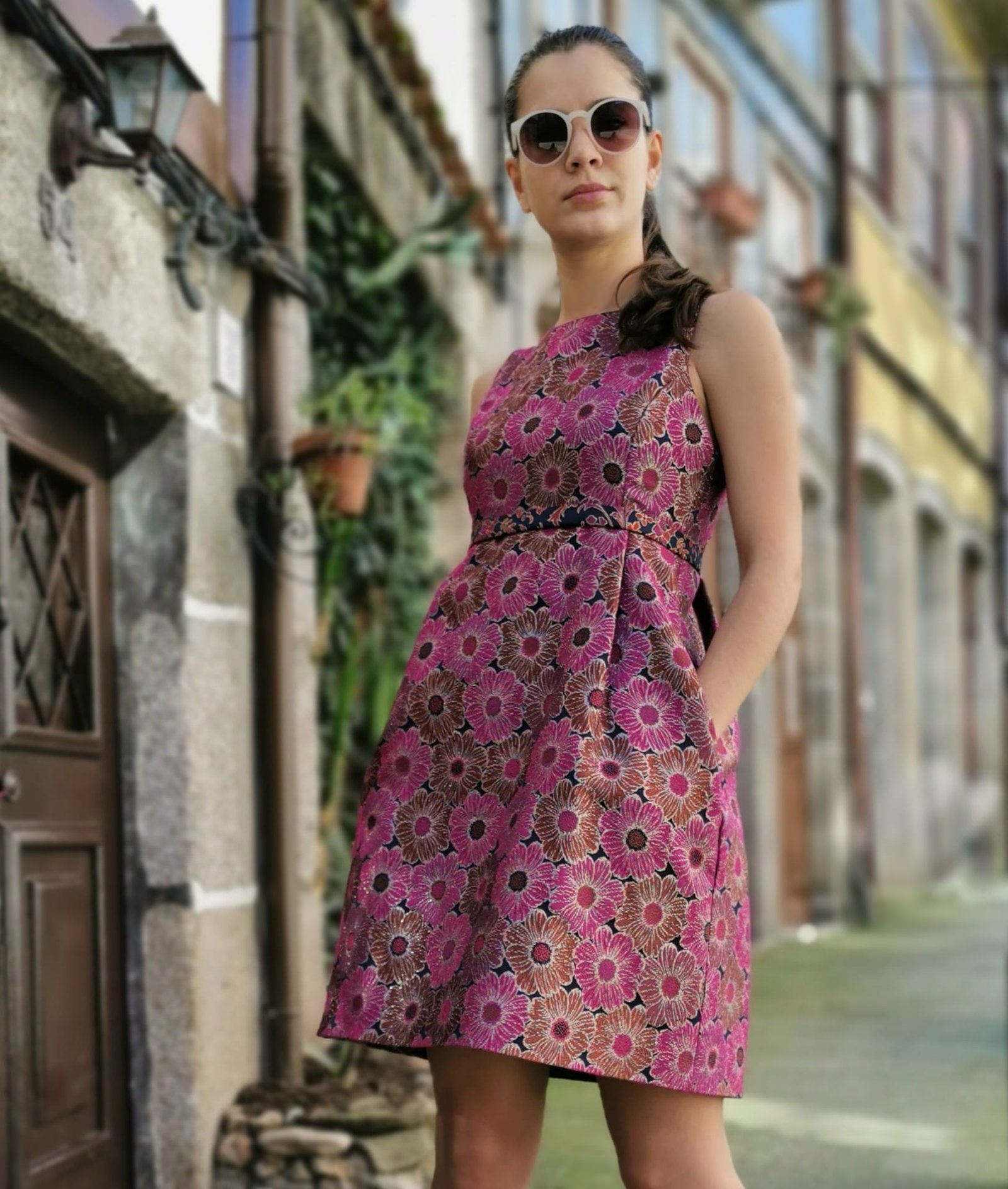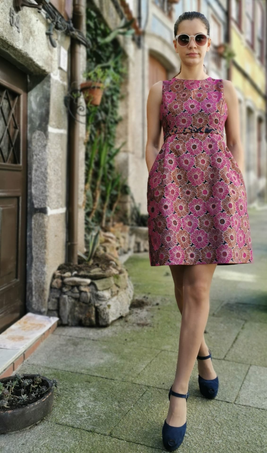 Vestido em brocado Multicolor, bolsos metidos nas laterais, aperta atrás com fecho invisível e cinto fixo em contrate.
