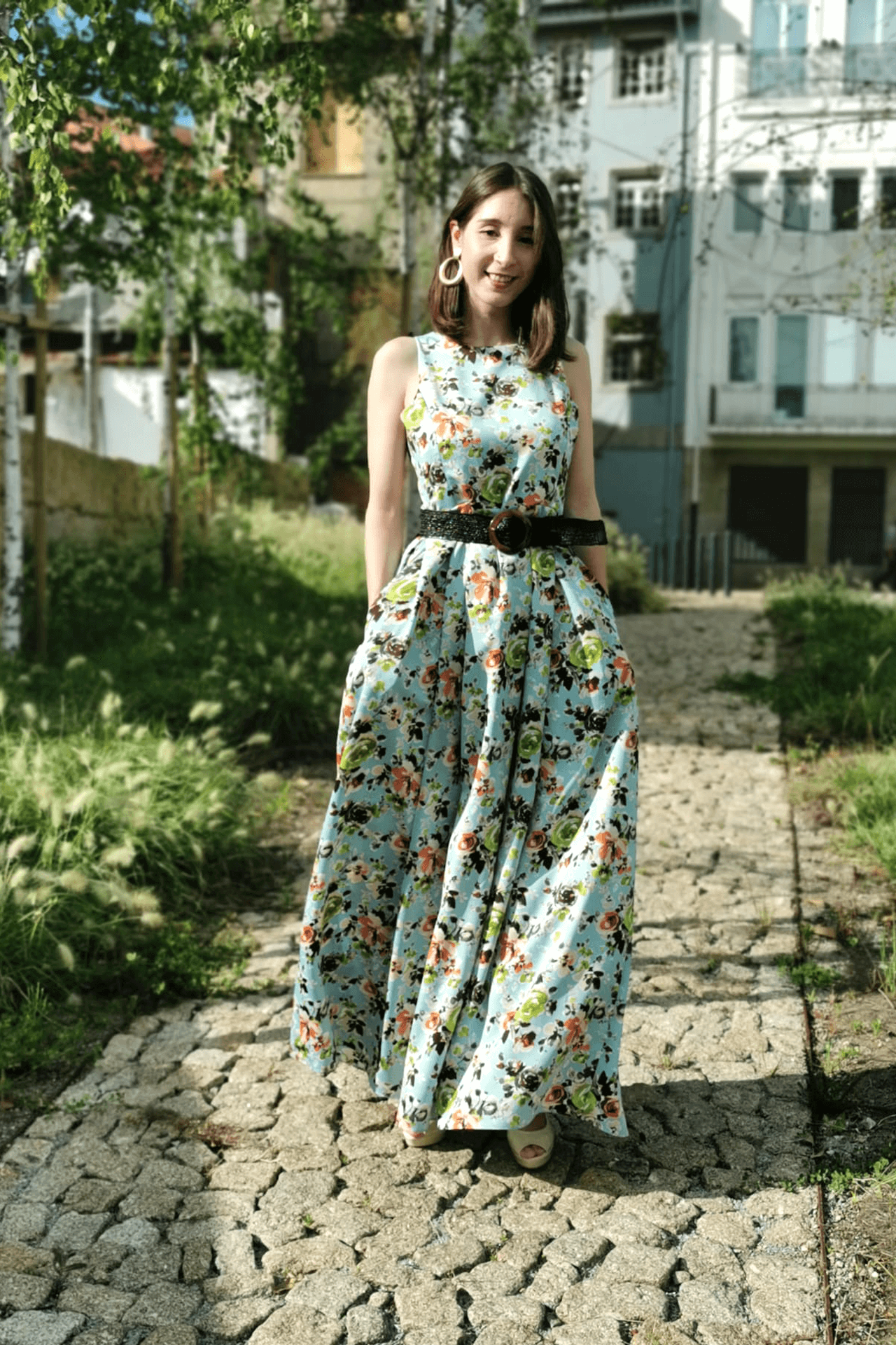 Vestido em crepe florido, decote redondo, bolsos escondidos, aperta atrás com fecho invisível (cinto não incluido)