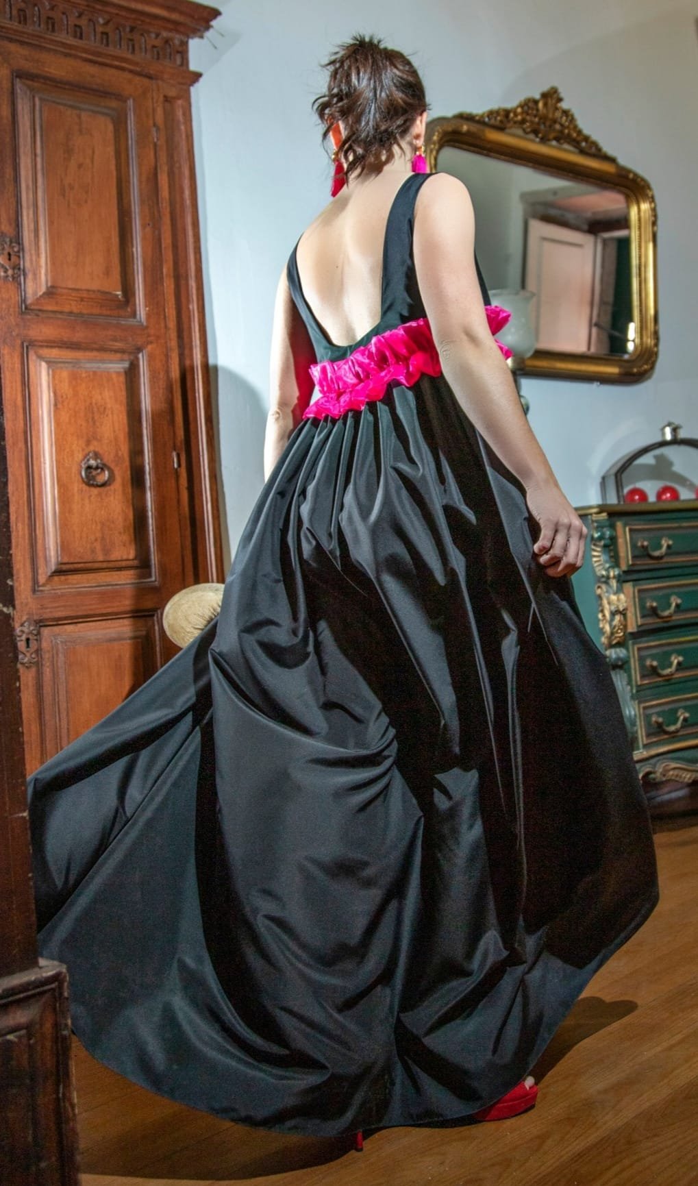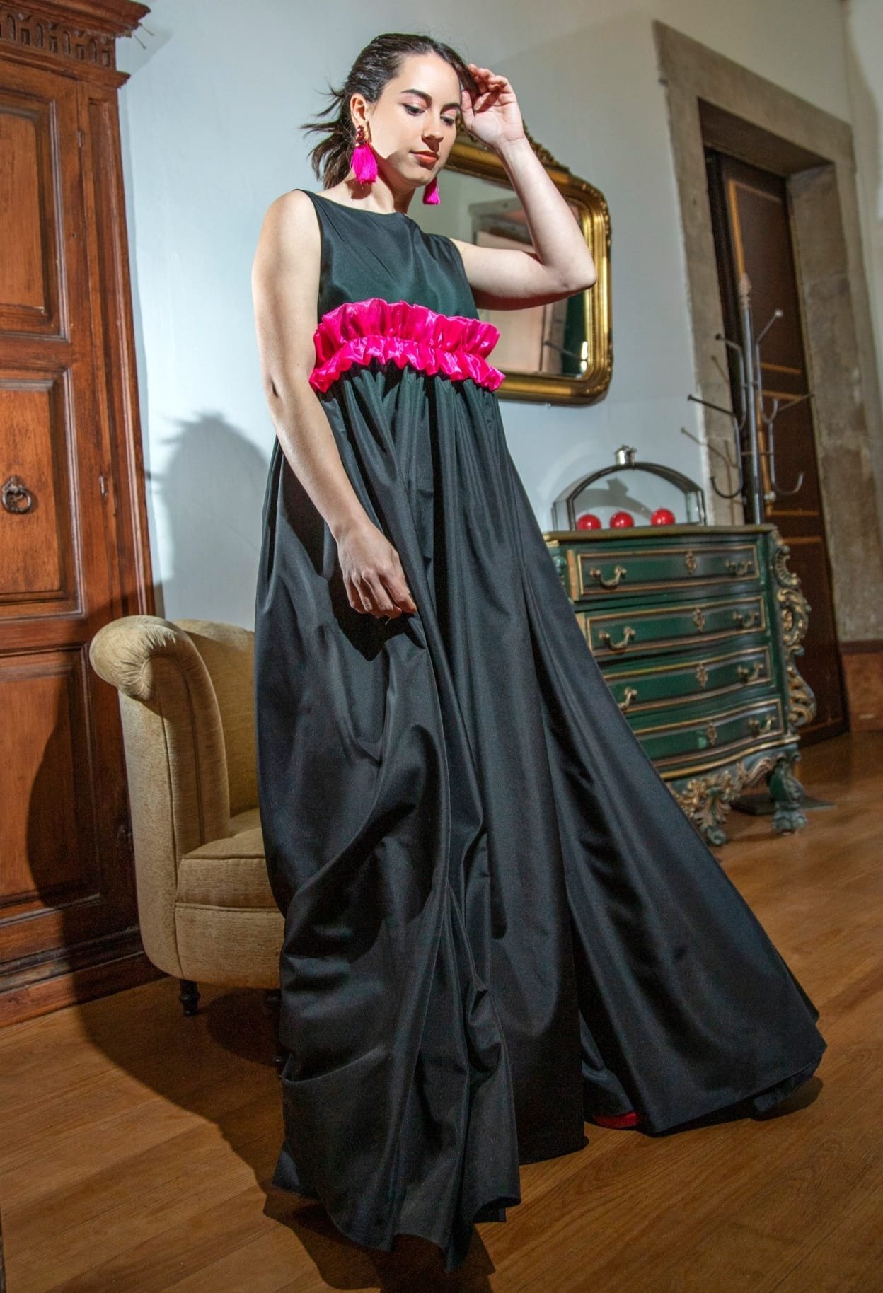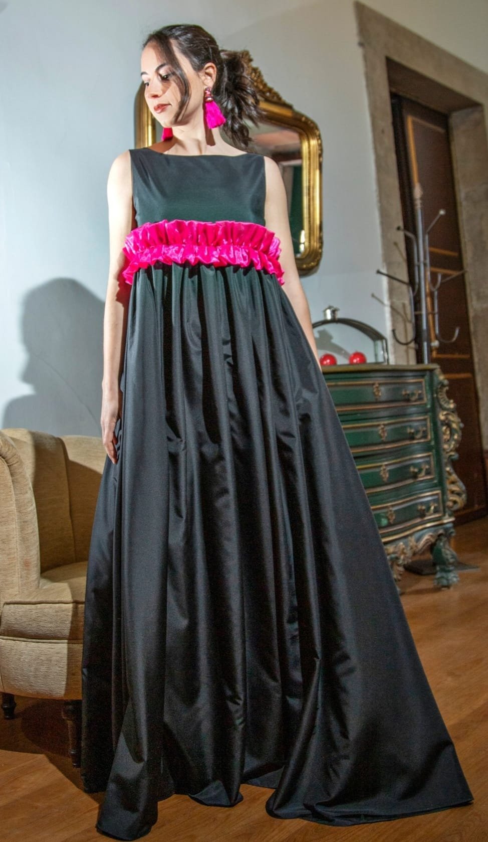 Vestido rodado efeito balão, folho em contraste á volta da cintura, bolsos metidos nas costuras laterais