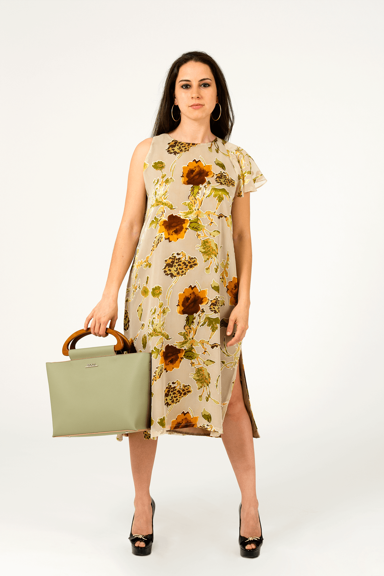Vestido em crepe fino corte reto, decote redondo com abertura atrás, rachas laterais e folho na diagonal.