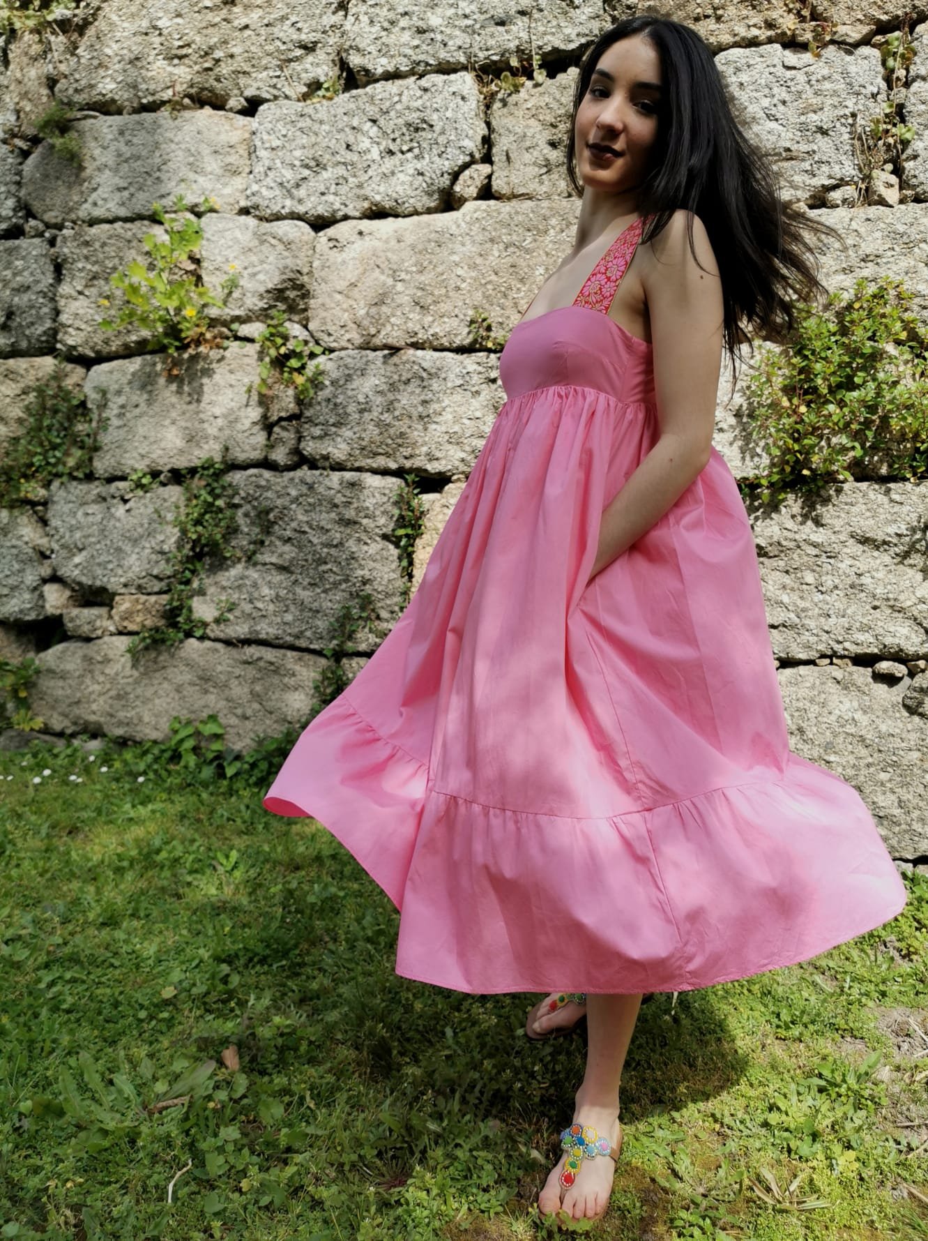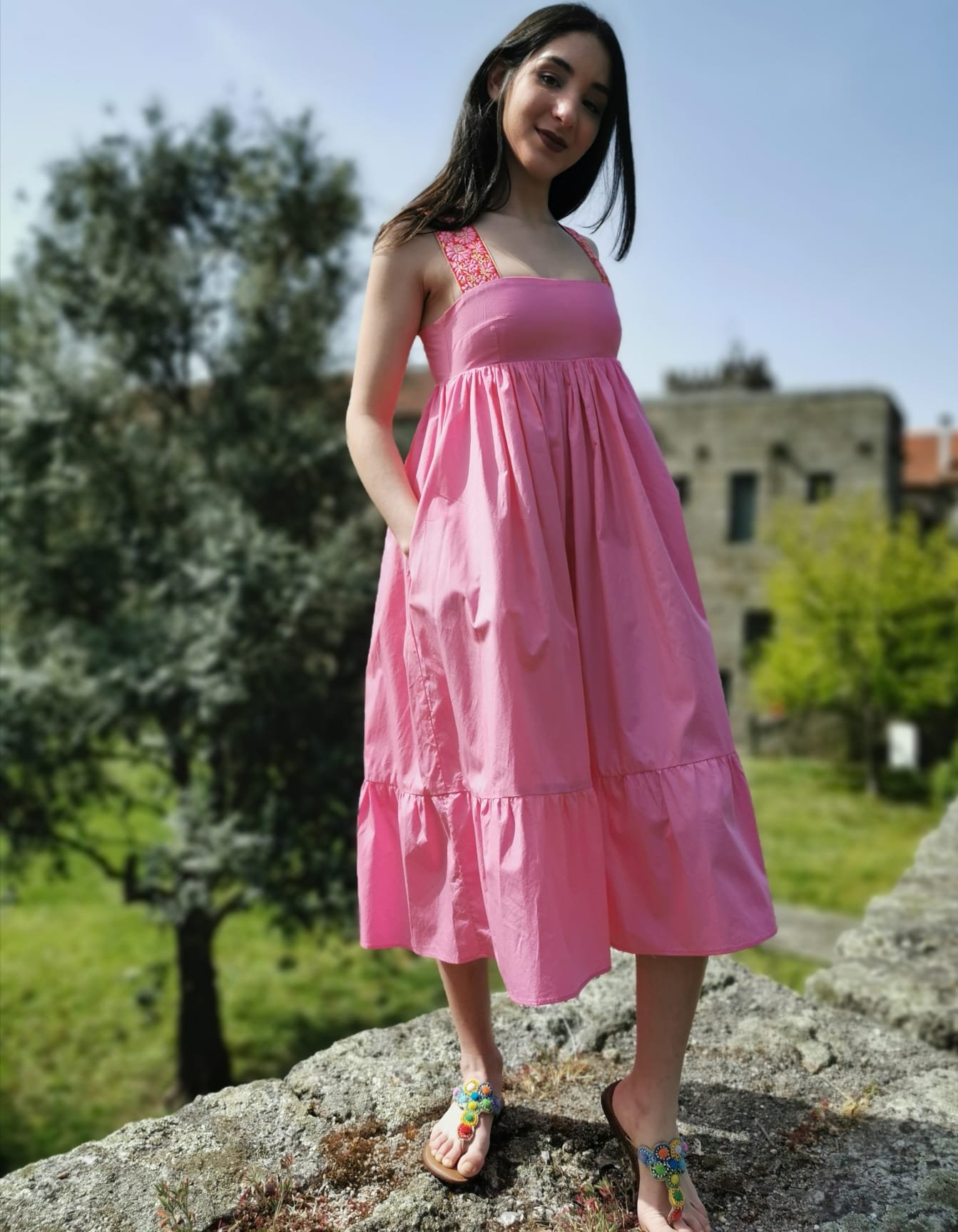 Vestido solto com folho na base, alças decoradas, aperta atrás com fita estilo ilhós