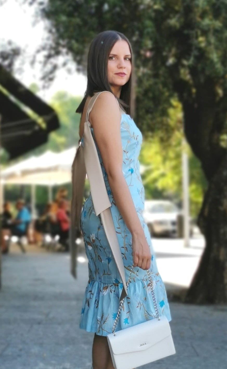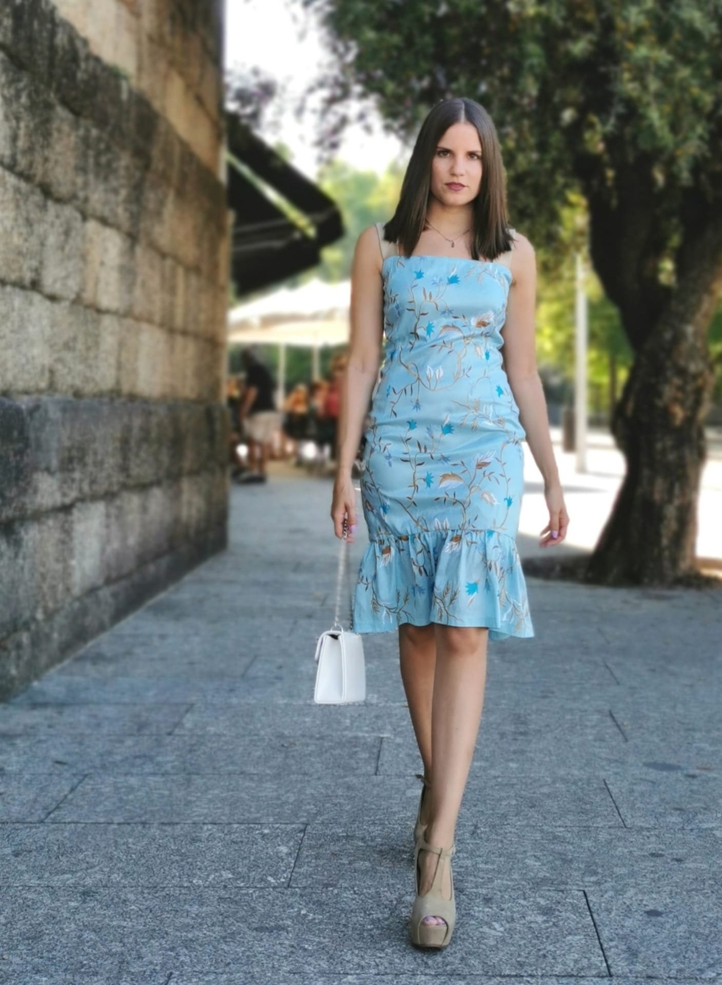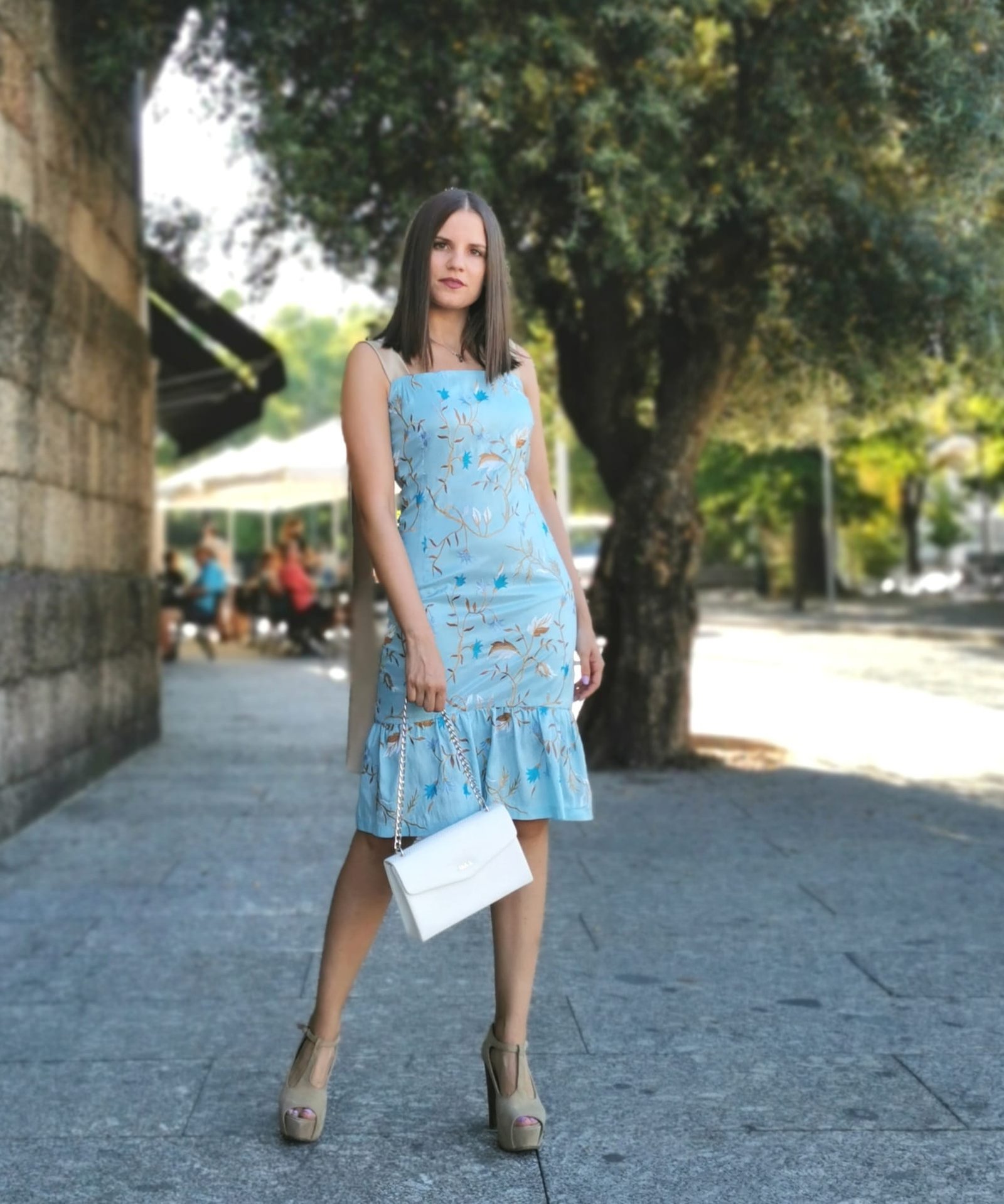 Vestido taffeta bordado cor azul, de alças em cor contraste bege; decote reto; fecho na base.